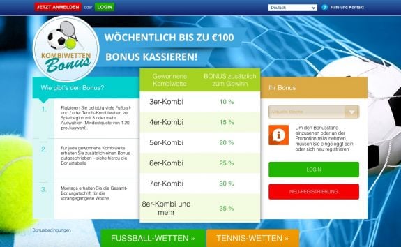 Hat der Tipper dann zum Beispiel eine Dreier-Kombi erfolgreich platziert, gibt es hierfür einen Gewinnbonus in Höhe von zehn Prozent. Steigt die Anzahl der kombinierten Wetten allerdings auf fünf an, wird auch der Bonus auf ganze 20 Prozent erhöht. Den maximalen Bonus von 35% der Gewinnsumme gibt es bei einer Achterkombi und größer. Zu beachten ist dabei, dass der maximale Bonus für jede Wette bei 100 Euro liegt. Diese können aber zum Glück nicht nur einmalig gesichert werden, sondern lassen sich jede Woche erneut einkassieren. Ausgezahlt wird der Bonus dann immer am Montag bis 18 Uhr, wobei dann der gesamte Bonus der vergangenen Woche ausgezahlt wird. Sobald das geschehen ist, kann der Bonus durch einen dreimaligen Umsatz zur Auszahlung gebracht werden. Hierbei gilt, dass jede Wette eine Mindestquote von 1,50 aufweisen muss. Zusätzlich sind diese Anforderungen in einem Zeitraum von 30 Tagen zu meistern.
